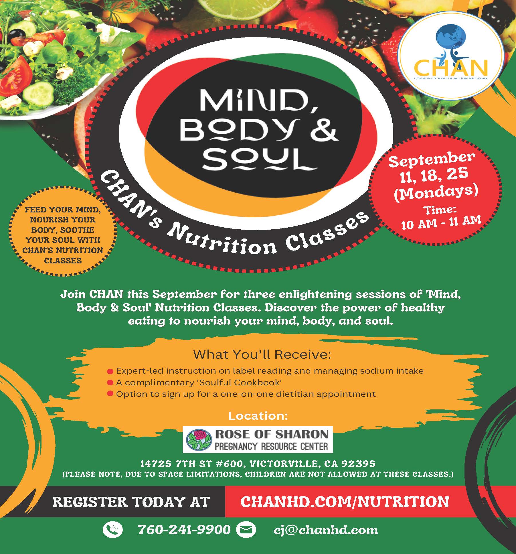 Mind, Body & Soul + Add to Google Calendar + iCal / Outlook export Date Sep 25 2023 Expired! Time 10:00 am - 11:00 am More Info Register Location Rose of Sharon 14725 7th Street #600 Victorville, CA 92395 Category Health & Nutrition Organizer CHAN Phone 760-241-9900 Email cj@chanhd.com Website https://chanhd.com/ Share this event