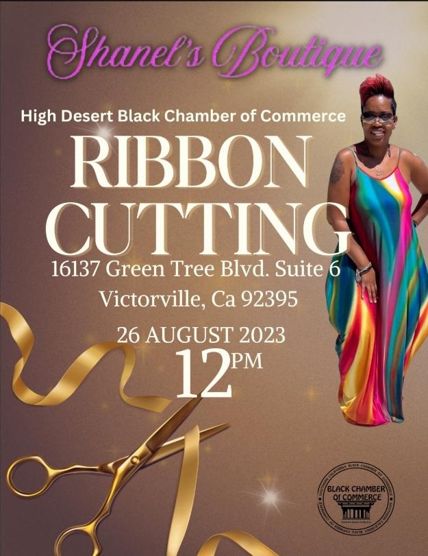 Shanel’s Boutique Ribbon Cutting + Add to Google Calendar + iCal / Outlook export Date Aug 26 2023 Expired! Time 12:00 pm Location Shanel's Boutique 16137 Green Tree Blvd. Ste. 6 Victorville, CA 92395 Category Mixer Organizer High Desert Black Chamber of Commerce Phone 909-910-7327 Website https://www.blackchamberofcommerce.org/ Share this event